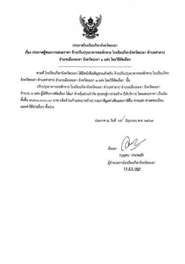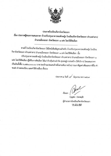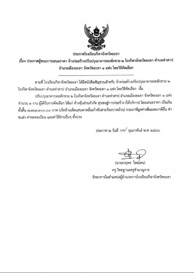 ประกาศผู้ชนะการเสนอราคา จ้างปรับปรุงอาคารหอพักหญิง โรงเรียนกีฬาจังหวัดยะลา