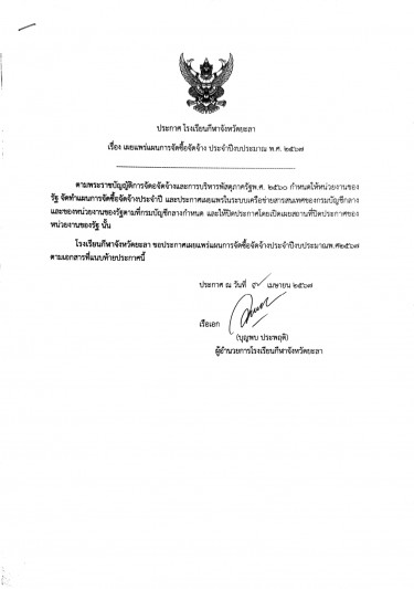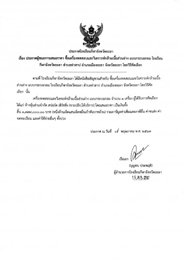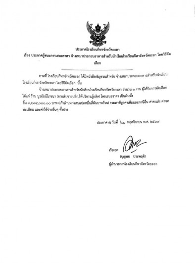 ประกาศผู้ชนะการเสนอราคา จ้างเหมาประกอบอาหารสำหรับนักเรียนโรงเรียนกีฬาจังหวัดยะลา...