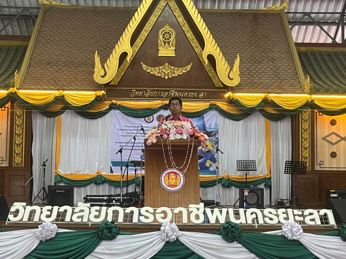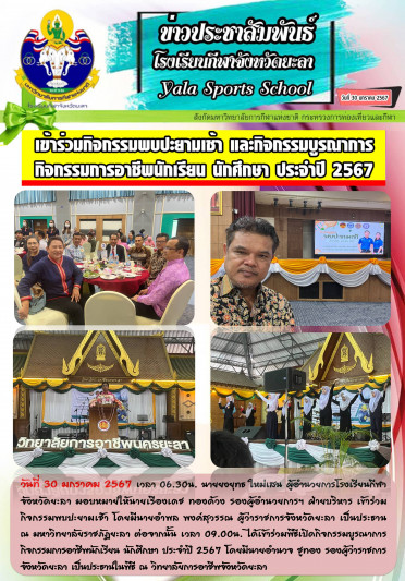 วันที่ 30 มกราคม 2567 เวลา 06.30น. นายยงยุทธ ใหม่เสน ผู้อำนวยการโรงเรียนกีฬาจังหวัดยะลา มอบหมายให้นายเรืองเดช ทองด้วง     รองผู้อำนวยการฯ ฝ่ายบริหาร เข้าร่วมกิจกรรมพบปะยามเช้า โดยมีนายอำพล พงค์สุวรรณ ผู้ว่าราชการจังหวัดยะลา เป็นประธาน  ณ มหาวิทยาลัยราชภัฎยะลา ต่อจากนั้น เวลา 09.00น. ได้เข้าร่วมพิธีเปิดกิจกรรมบูรณาการกิจกรรมการอาชีพนักเรียน นักศึกษา ประจำปี 2567 โดยมีนายอำนวจ ชูทอง รองผู้ว่าราชการจังหวัดยะลา เป็นประธานในพิธี ณ วิทยาลัยการอาชีพจังหวัดยะลา