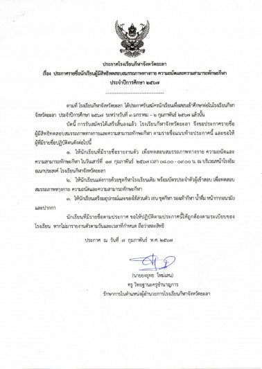 ประกาศรายชื่อนักเรียนผู้มีสิทธิทดสอบสมรรถภาพทางกาย ความถนัดและความสามารถทักษะกีฬา ประจำปีการศึกษา 2567