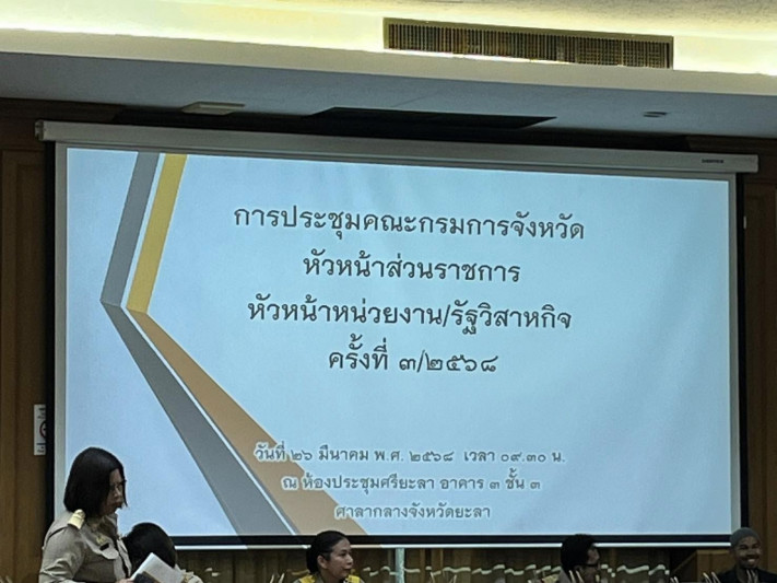วันที่ 26 มีนาคม 2568 เรือเอกบุญพบ ประพฤติ ผู้อำนวยการโรงเรียนกีฬาจังหวัดยะลา มอบหมายให้นายเรืองเดช ทองด้วง รองผู้อำนวยการฝ่ายบริหาร เข้าร่วมการประชุมคณะกรมการจังหวัด หัวหน้าส่วนราชการ หัวหน้าหน่วยงาน/รัฐวิสาหกิจ ครั้งที่ 3/2568 ณ ห้องประชุมศรียะลา อาคาร 3 ชั้น 3 ศาลากลางจังหวัดยะลา