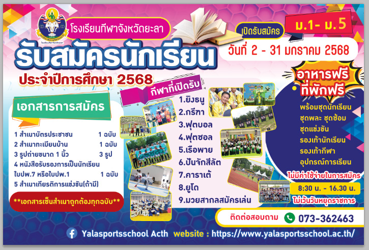 ประกาศรับนักเรียนเข้าเรียนโรงเรียนกีฬาจังหวัดยะลา ประจำปีการศึกษา 2568