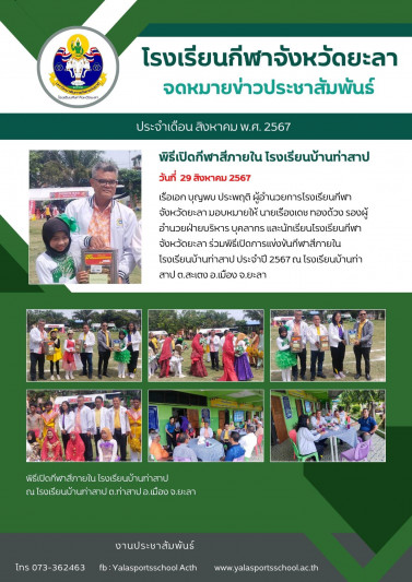 โรงเรียนกีฬาจังหวัดยะลา เลขที่ 79 หมู่ที่ 5 ตำบลท่าสาป อำเภอเมือง จังหวัดยะลา 95000 โทรศัพท์ : 0-7336-2497 โทรสาร : 0-7336-2463