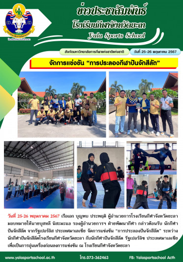 โรงเรียนกีฬาจังหวัดยะลา เลขที่ 79 หมู่ที่ 5 ตำบลท่าสาป อำเภอเมือง จังหวัดยะลา 95000 โทรศัพท์ : 0-7336-2497 โทรสาร : 0-7336-2463
