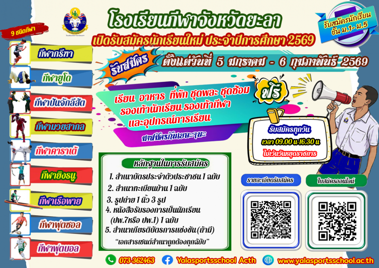 โรงเรียนกีฬาจังหวัดยะลา เปิดรับสมัครนักเรียนใหม่ ประจำปีการศึกษา 2569