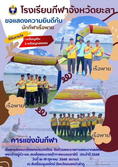 ขอแสดงความยินดีกับนักกีฬาเรือพายโรงเรียนกีฬาจังหวัดยะลาที่ได้รับถ้วยรางวัลการแข่งขันกีฬาเรือพายประจำปี...