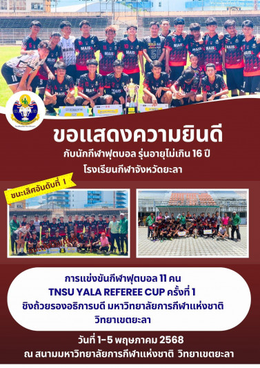 ขอแสดงความยินดีกับนัก ฟุตบอลรุ่นอายุไม่เกิน 16 ปีโรงเรียนกีฬาจังหวัดยะลาได้รับรางวัลชนะเลิศอันดับที่1...