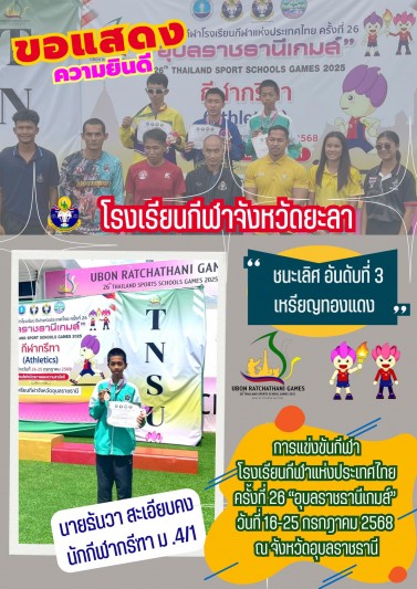 ขอแสดงความยินดี กับนายธันวา สะเอียบคง นักกีฬากรีฑา โรงเรียนกีฬาจังหวัดยะลา...