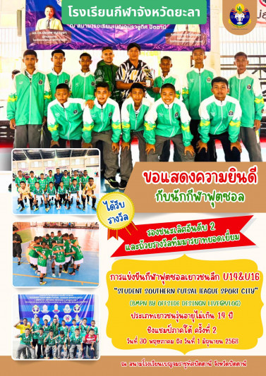 ขอแสดงความยินดี กับนักกีฬาฟุตซอลโรงเรียนกีฬาจังหวัดยะลาที่ได้รับรางวัลรองชนะเลิศอันดับที่สองและถ้วยรางวัลทีมมารยาทยอดเยี่ยม...